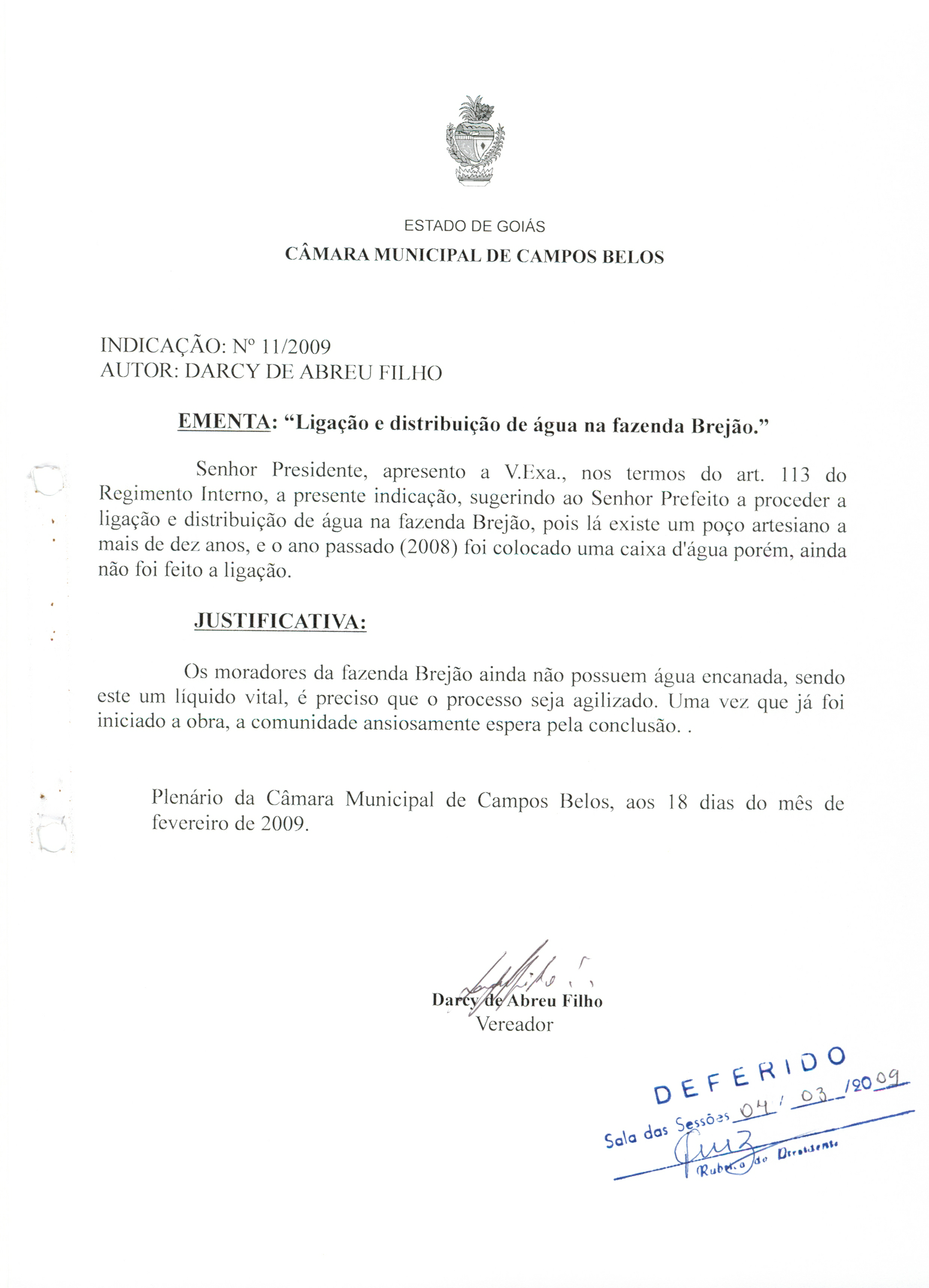 Ementa: LIGAÇÃO E DISTRIBUIÇÃO DA ÁGUA NA FAZENDA BREJÃO
