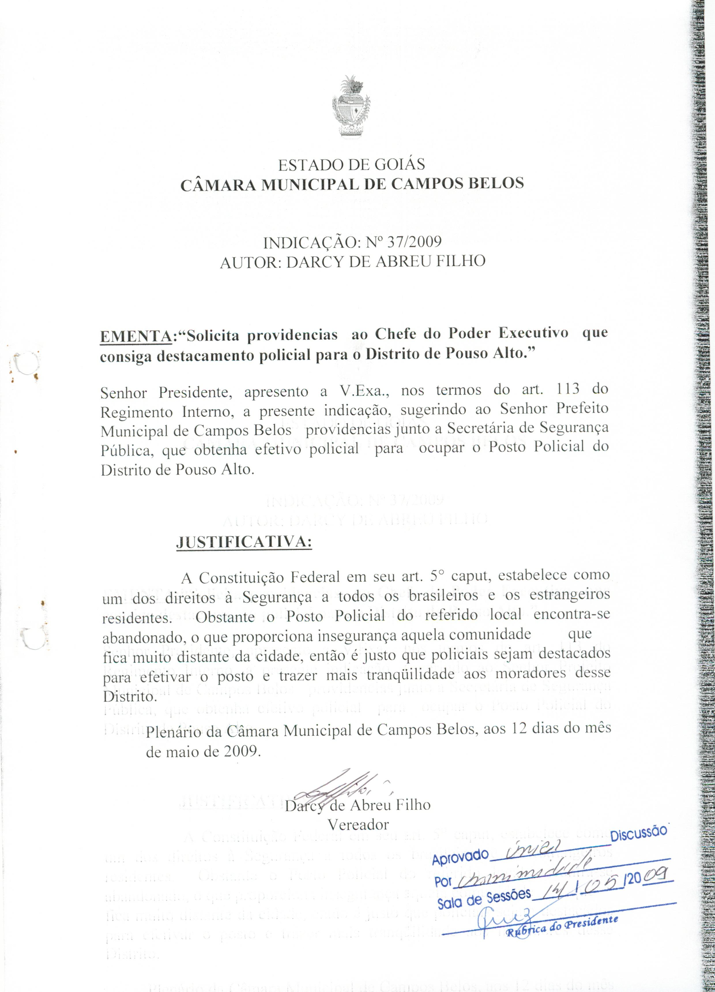 Ementa: SOLICITA PROVIDENCIAS AO CHEFE DO PODER EXECUTIVO QUE CONSIGA DESTACAMENTO POLICIAL PARA O DISTRITO POUSO ALTO