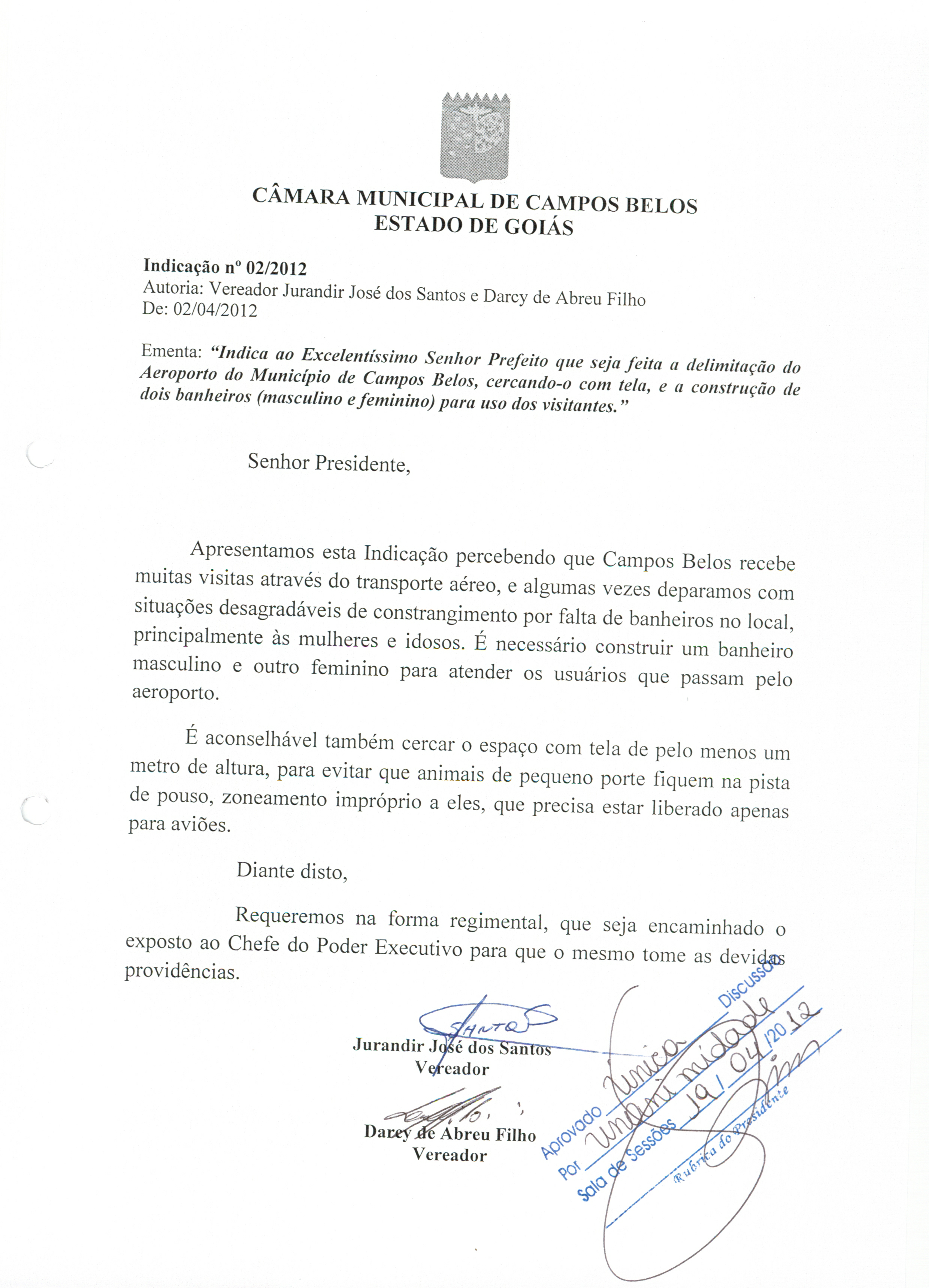 Ementa: INDICA QUE SEJA FEITA A DELIMITAÇÃO DO AEROPORTO AO MUNICIPIO DE CAMPOS BELOS, CERCANDO COM TELA, E A CONSTRUÇÃO DE DOIS BANHEIROS(MASCULINO E FEMININO) PARA USO DOS VISITANTES